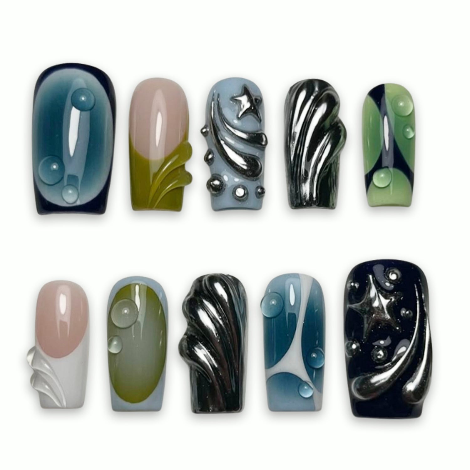 Our press-on nail sizes are listed from Thumb – Index – Middle – Ring – Pinky (left to right). Each set is crafted for a seamless, natural fit. Please refer to our sizing chart to find the best match for your nail beds.