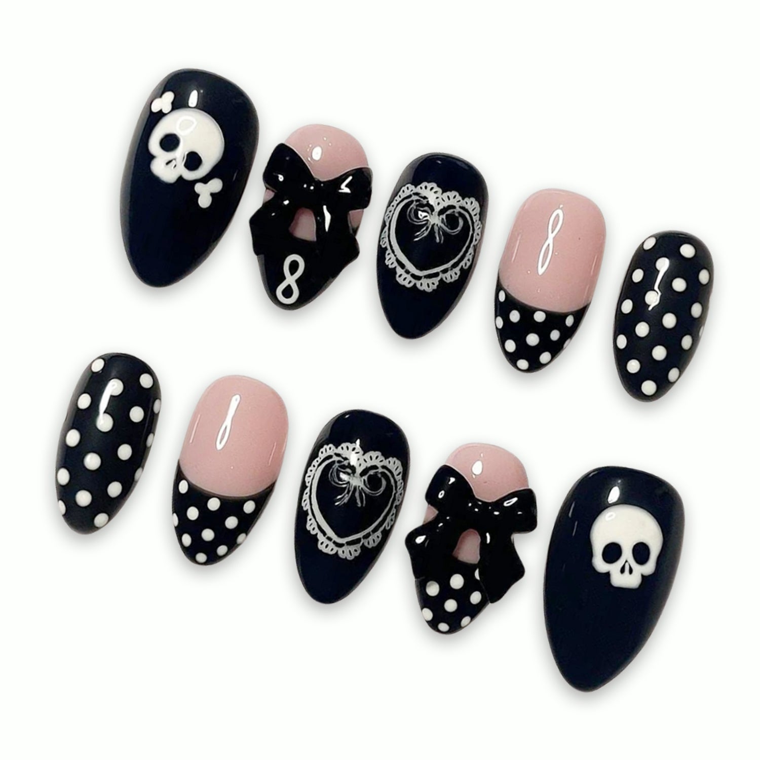 Our press-on nail sizes are listed from Thumb – Index – Middle – Ring – Pinky (left to right). Each set is crafted for a seamless, natural fit. Please refer to our sizing chart to find the best match for your nail beds.